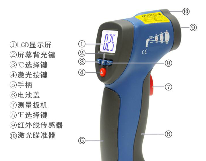 ① 握住儀表手柄并使前端紅外線傳感器指向被測物體表面;